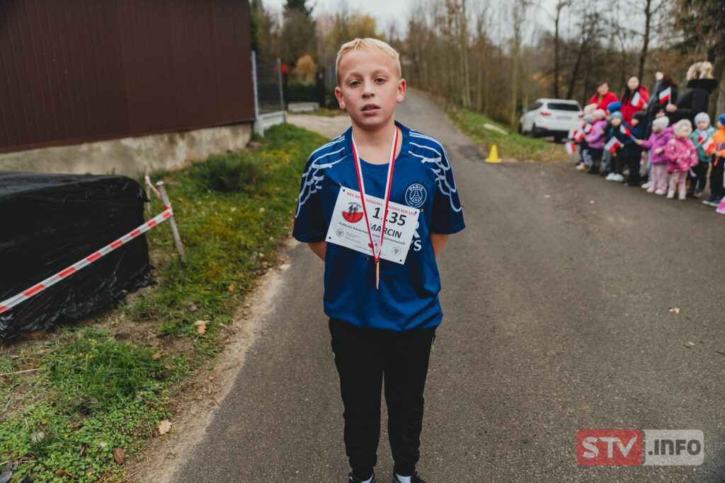 Pierwszy na mecie patriotycznego biegu pojawił się Marcin uczeń szkoły w Gieraszowicach.